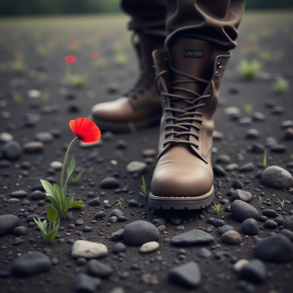 This image shows a muddy combat boot stepping near a vibrant red poppy growing from cracked earth. The somber scene contrasts bleakness with a symbol of hope and resilience.