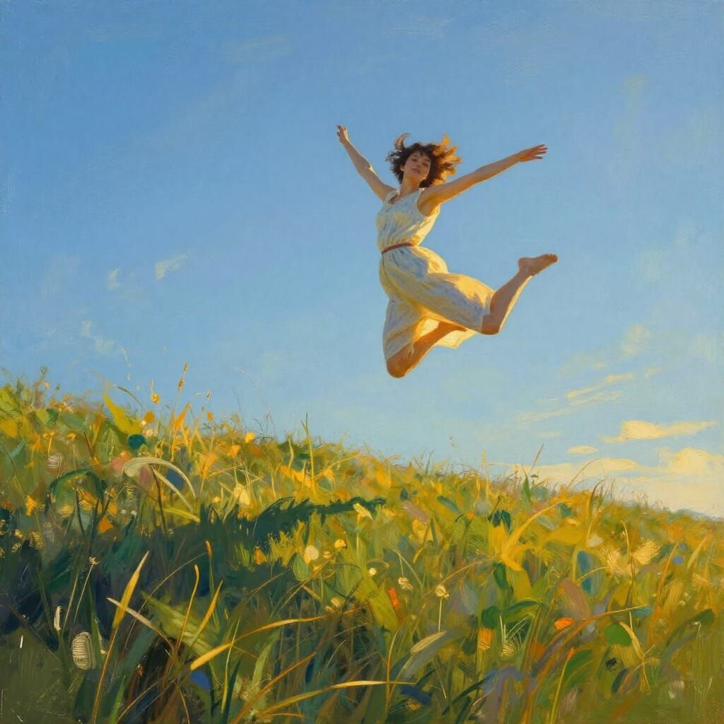 This image captures a woman joyfully leaping from a grassy hill into a clear sky during golden hour. Rendered in a vibrant, painterly style with visible brushstrokes, it evokes a dreamlike atmosphere of whimsical freedom.