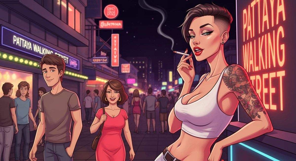 A vivid cartoon of Pattaya Walking Street at night, filled with neon and crowds. A Thai woman with a tattoo and red lips leans against a wall in a dynamic scene with bold colors.