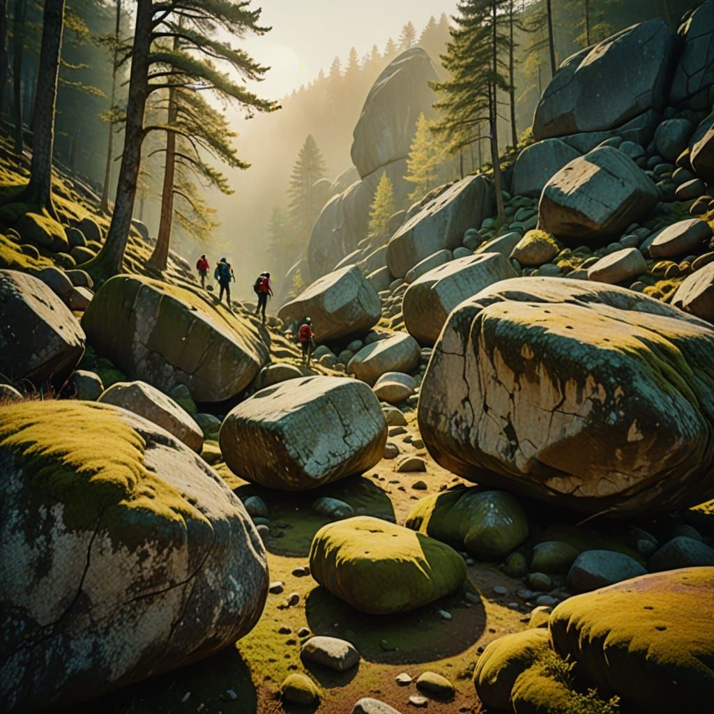 This image captures a cinematic moment of hikers navigating giant boulders in Iceland's mystical landscape, bathed in warm golden light and surrounded by soft mist, creating an atmosphere of epic drama.