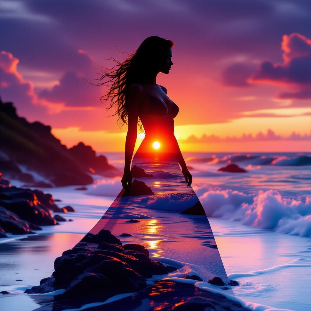 This image shows a goddess silhouette blended with a vibrant sunset coast. Orange, pink, and purple hues merge with coastal details like waves and rocks in a fine art photography style.
