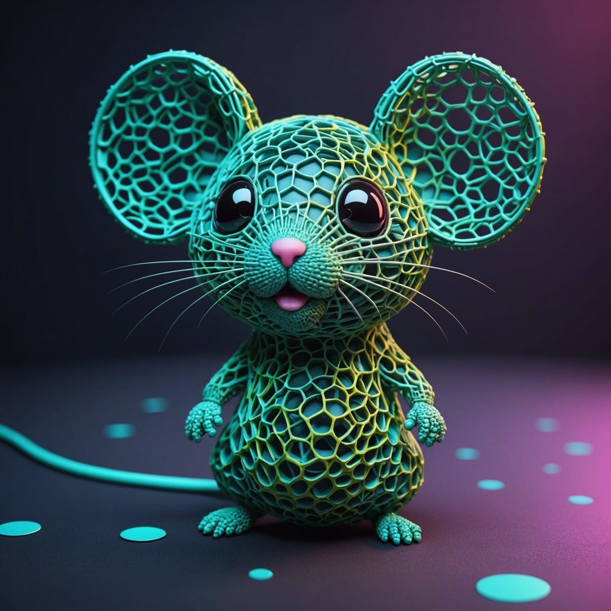This image shows a 3D rendered aqua chibi mouse formed from textured organic material. The artwork features neon colors and a hyperdetailed abstract background in a nature photography style.