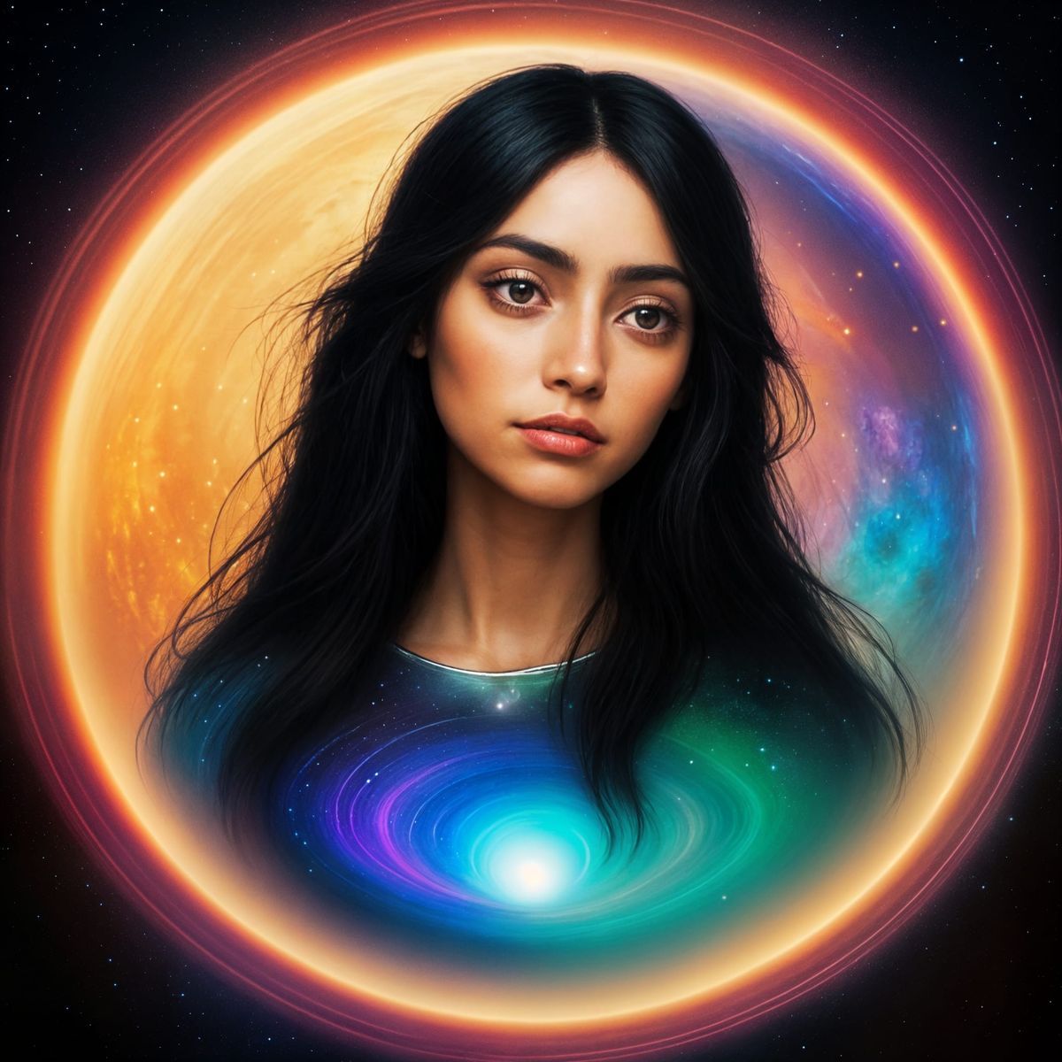 This image shows a mystical Latina woman with long dark hair and striking eyes, set against a distant planetary backdrop, exuding an ethereal and spiritual aura.