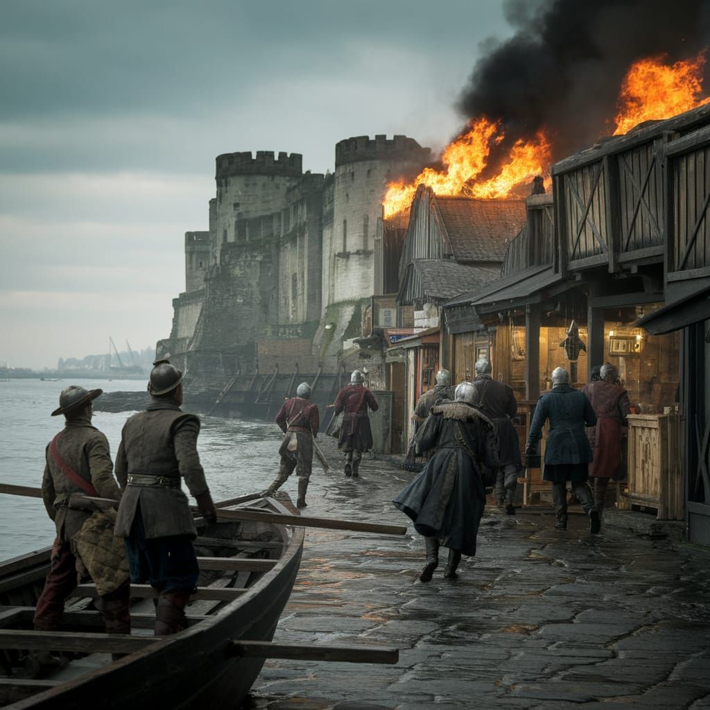 A cinematic image of medieval marines setting fires on a bustling wharf, as shopkeepers flee in panic, with a medieval city in the background and overcast skies.