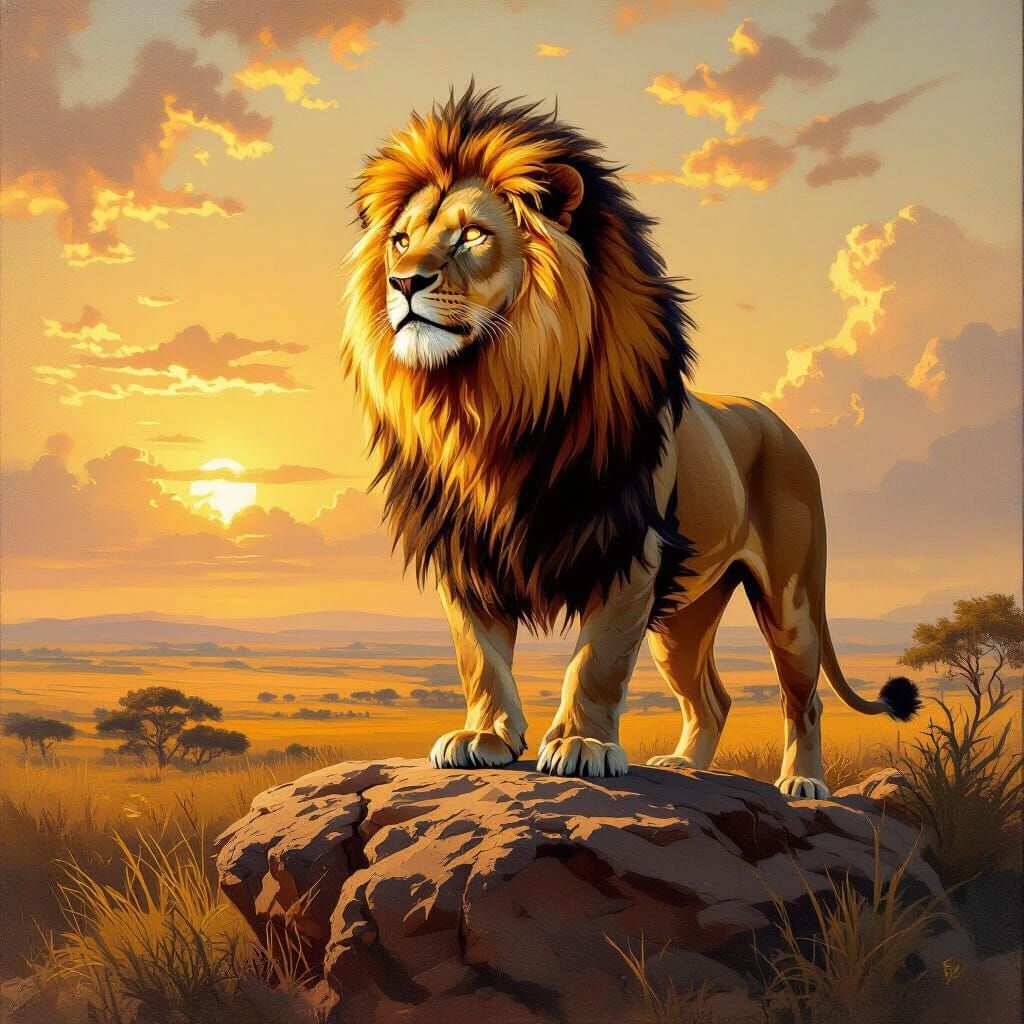 This image shows a regal lion with a fiery mane standing on a rocky crag, surveying a sunlit savanna. The artwork captures the scene with warm hues and bold brushstrokes, reminiscent of classical oil paintings.