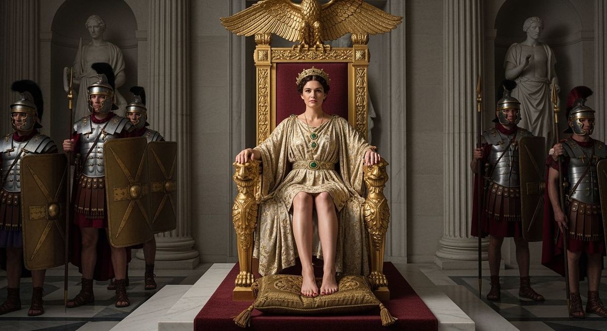 This image shows Empress Messalina on her throne, surrounded by Roman legionnaires. The opulent throne room is captured with sharp focus and realistic textures, reminiscent of classical portraiture.