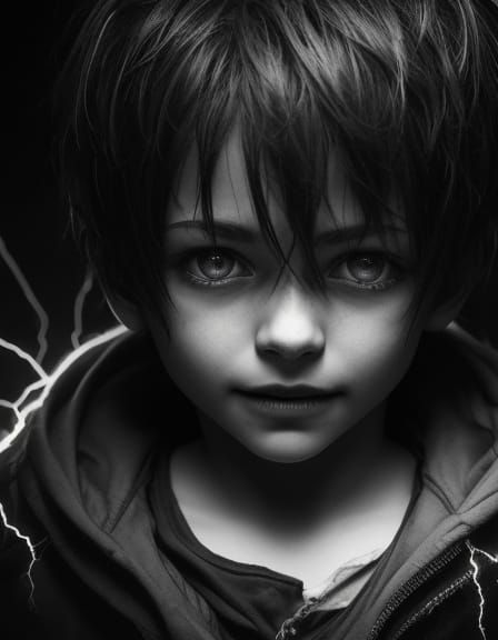This image shows a close-up portrait of a smiling boy with glowing eyes. The artwork uses chiaroscuro and dramatic lighting to create a mysterious and surreal abstract expressionist effect.