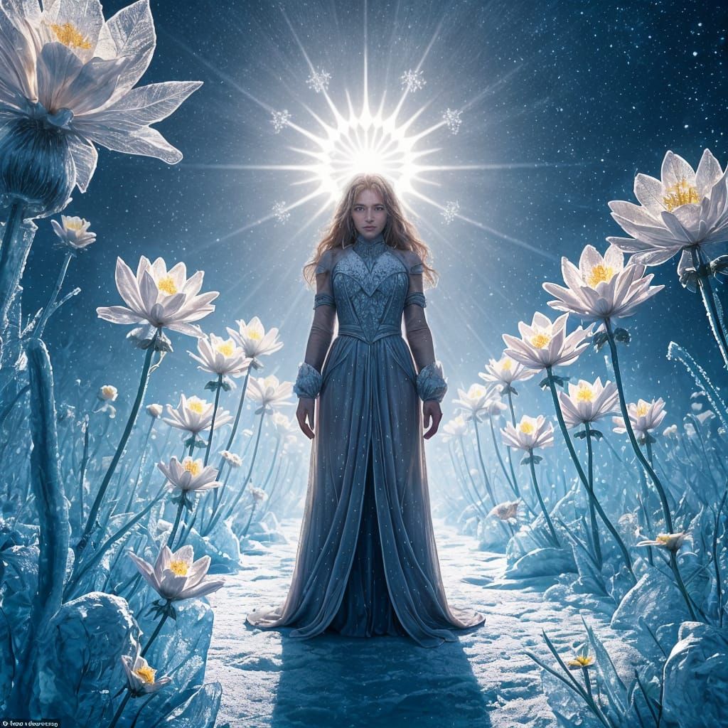 This image shows a breathtakingly beautiful winter wonderland with flowers made of pure ice, their delicate petals shimmering like frozen fire.