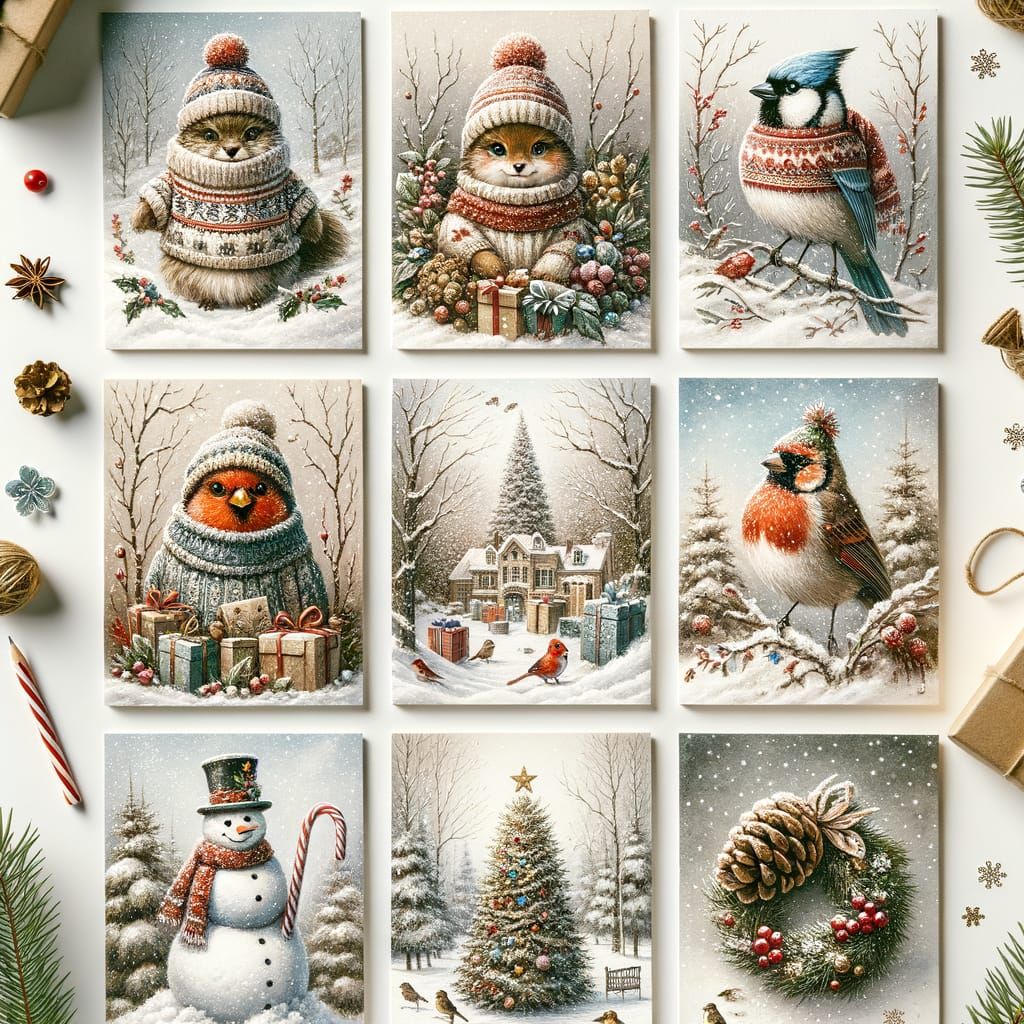 This image displays a vintage-style collection of six Christmas cards, each featuring whimsical watercolor scenes of woodland creatures, winter yards, snowmen, cozy holidays, candy canes, and pinecones, radiating holiday happiness.