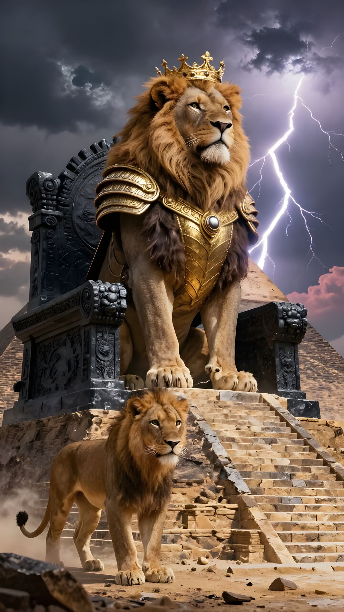 This image depicts a majestic male lion in golden armor and crown, standing on a unique pyramid throne. A lioness and cub are present under a stormy, lightning-filled sky.
