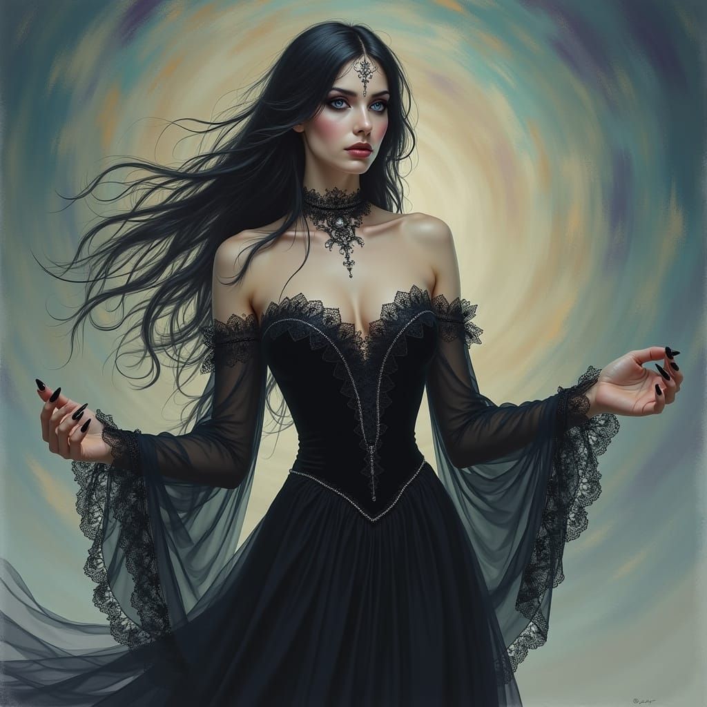 A digital painting of a gothic sorceress with long dark hair and dramatic makeup, set against a swirling blue and purple background. The artwork evokes dark romanticism.