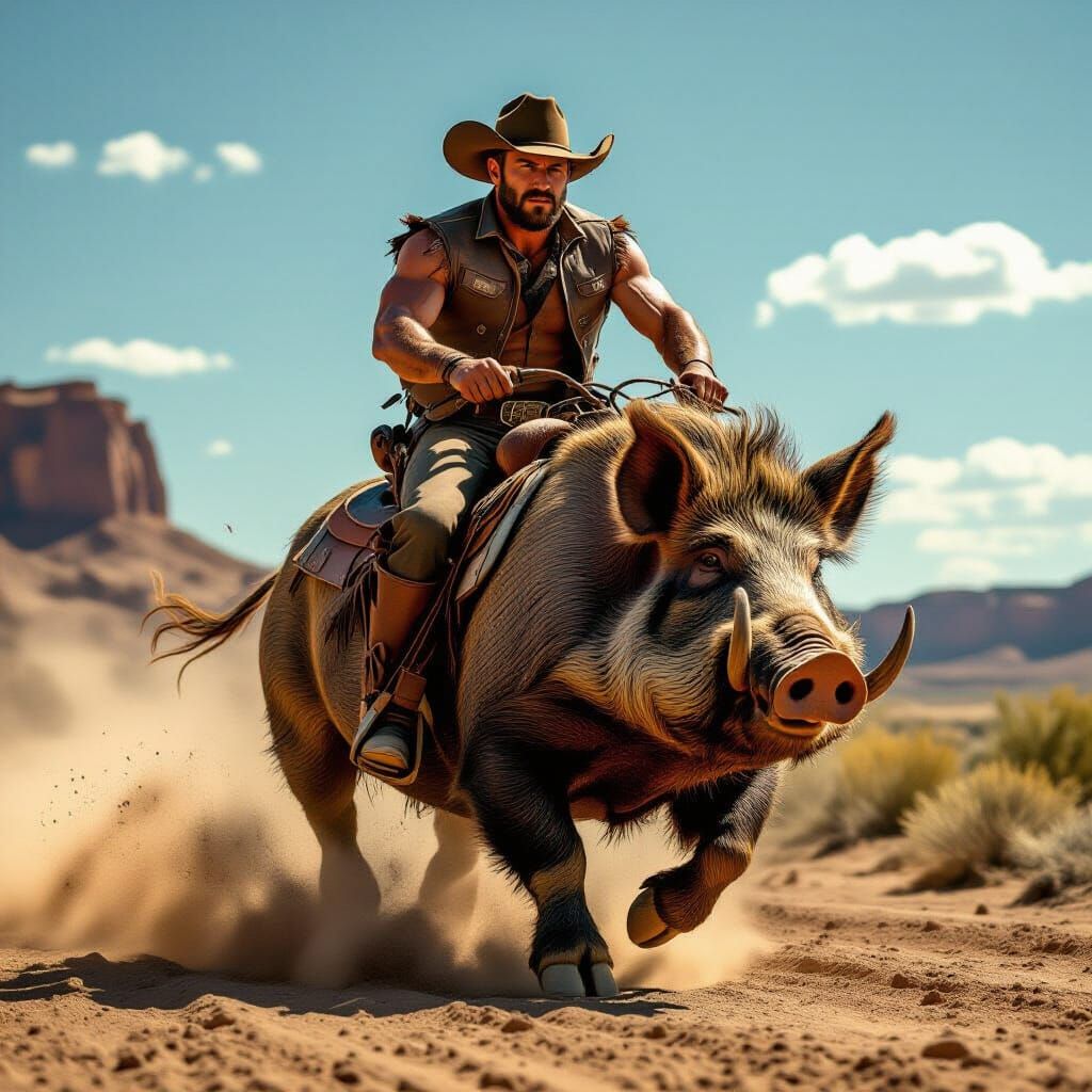 A hyperrealistic image of a rugged cowboy on a powerful boar in a sun-baked Western setting. The scene features dramatic lighting and earthy tones, capturing a gritty, cinematic feel.
