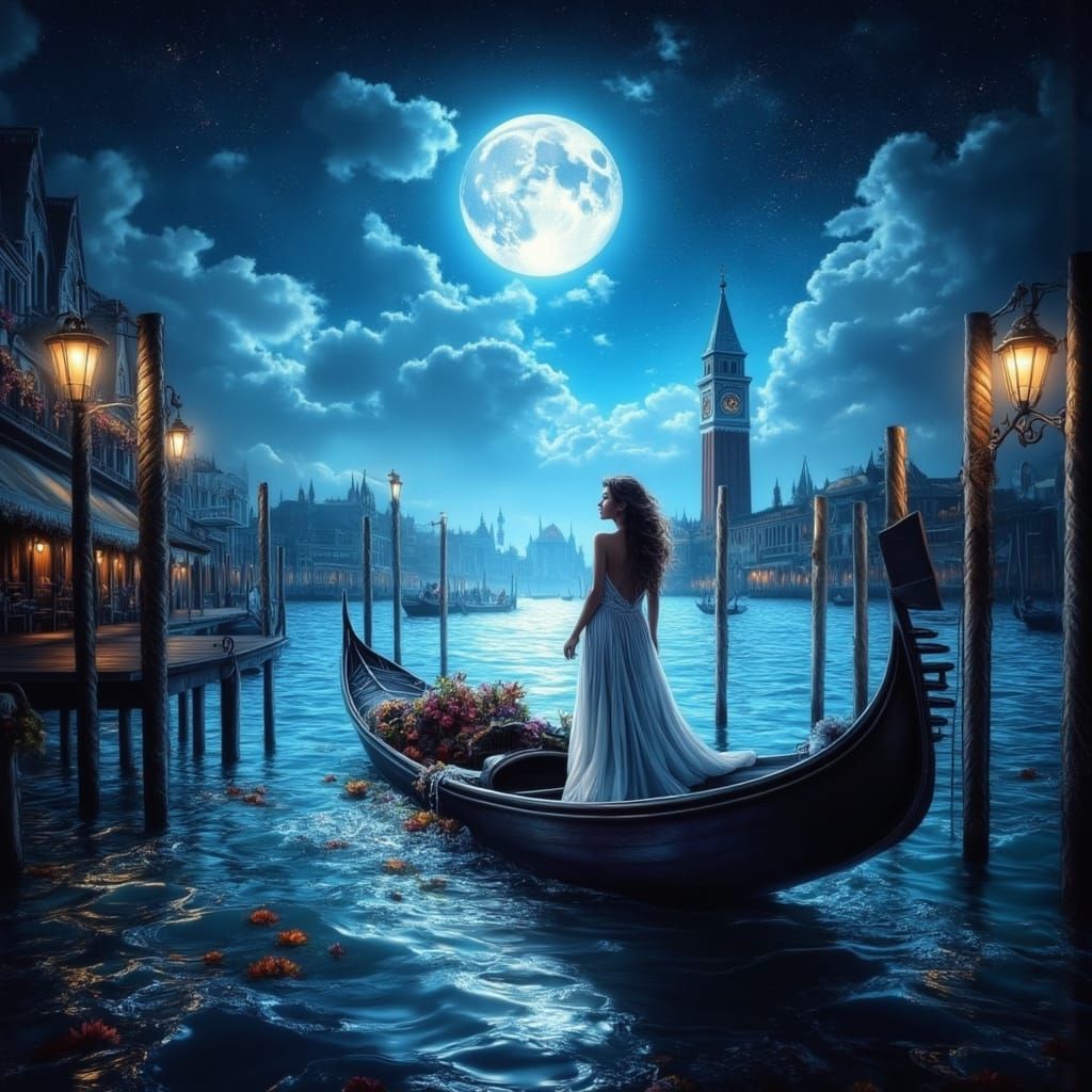 This image shows a woman in an evening gown on Venice's Grand Canal, with a loved one, at night. The surreal atmosphere evokes the styles of Dali, Magritte, and Beksiński.