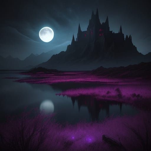 This image shows a hauntingly beautiful dark fantasy landscape with a full moon casting an eerie glow on the luminescent stars and purple water below. Soft, ethereal light dances across the ripples, creating a dreamlike atmosphere with an otherworldly energy.