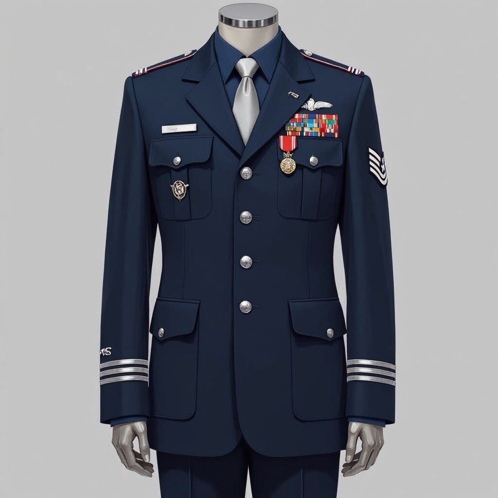 A mannequin displays a futuristic military uniform. The navy coat, silver tie, and award ribbons suggest high rank. The image blends digital realism with industrial and futuristic design elements.