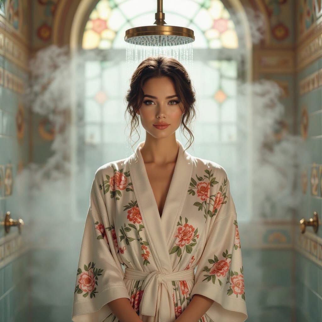 A glamorous woman in a bathrobe stands in a steamy shower. The image evokes Art Nouveau aesthetics with vibrant colors and delicate lines, rendered in a hyperrealistic, cinematic style.