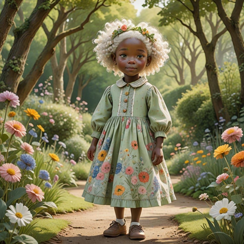 This image showcases a charming, Afro-descendant girl with albinism, radiating joy in a whimsical children's book illustration style. Soft lighting, vibrant colors, and delicate line work bring her to life in a beautiful, dreamy atmosphere.