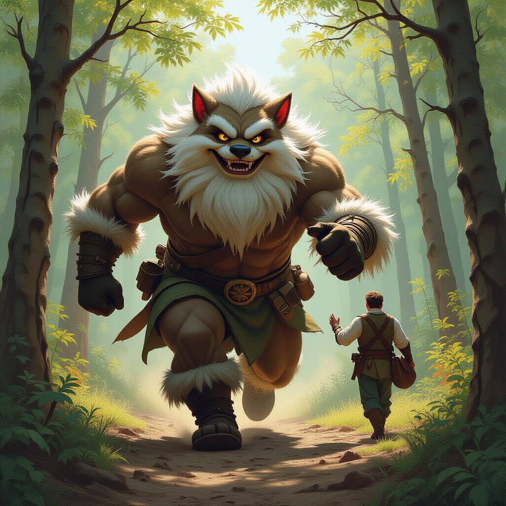 This image shows a large, shaggy, smiling Pan figure running through a forest. The artwork has earthy tones and highly realistic details, in an oil painting style.