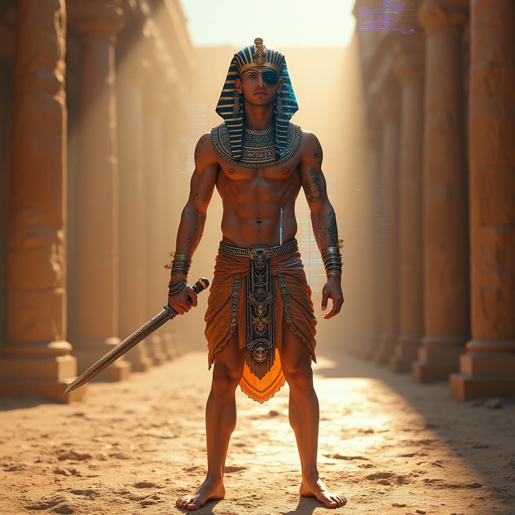 This image shows a muscular, shirtless young Pharaoh with golden-brown skin and an eye patch, holding a cutlass. The artwork blends cyberpunk and mythological elements, featuring digital distortions, neon accents, and a luminous digital desert backdrop.