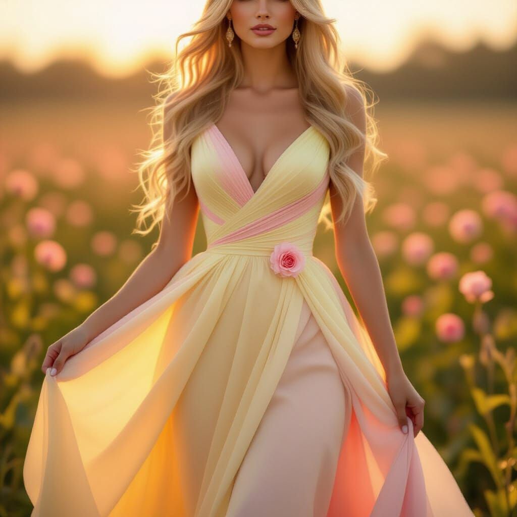 This image shows an elegant woman with blonde hair in a gown that shifts from yellow to pink, ending in roses. Photorealistic style with golden hour lighting.