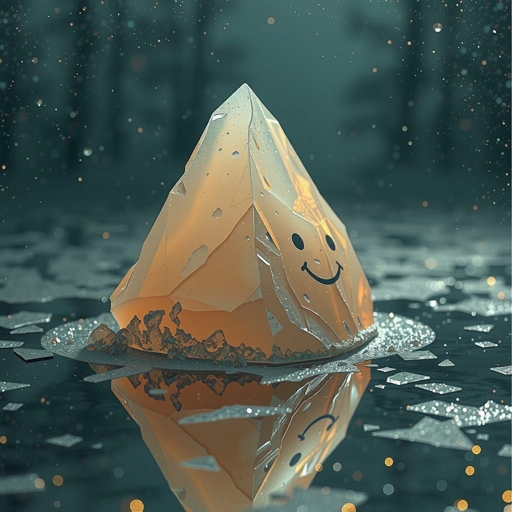 This hyper-realistic CGI image features a fragile, translucent plastic sculpture made of gold flakes, slowly melting into ice crystals. It has a cute, sleepy smiling face etched onto its surface.