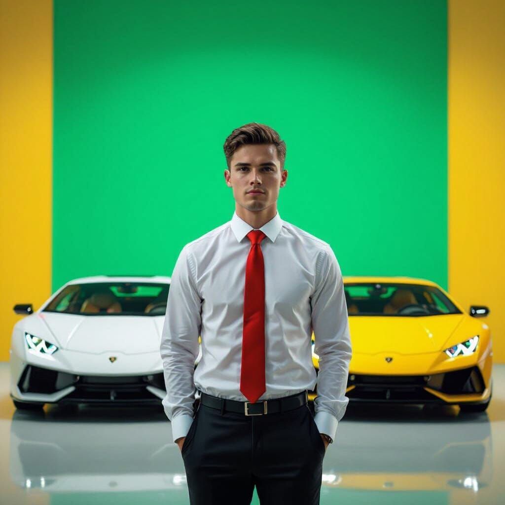 This image shows a man in front of Lamborghini and Audi supercars with a vibrant backdrop. The scene is reminiscent of digital artwork with cinematic lighting and vivid colors.