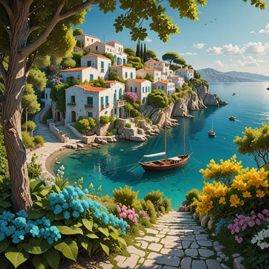 This image depicts a picturesque Greek village surrounded by lush vegetation, boats in the calm turquoise sea, and vibrant flowers, all captured in warm sunlight with photorealistic detail and subtle texture, reminiscent of a perfectly preserved fresco.