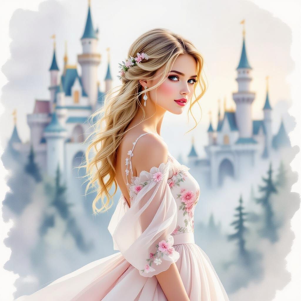 A watercolor portrait of a blonde woman in profile. She wears an embroidered gown that blends into the misty background. A fairytale castle with spires fades into the background. Rendered in soft traditional watercolor.