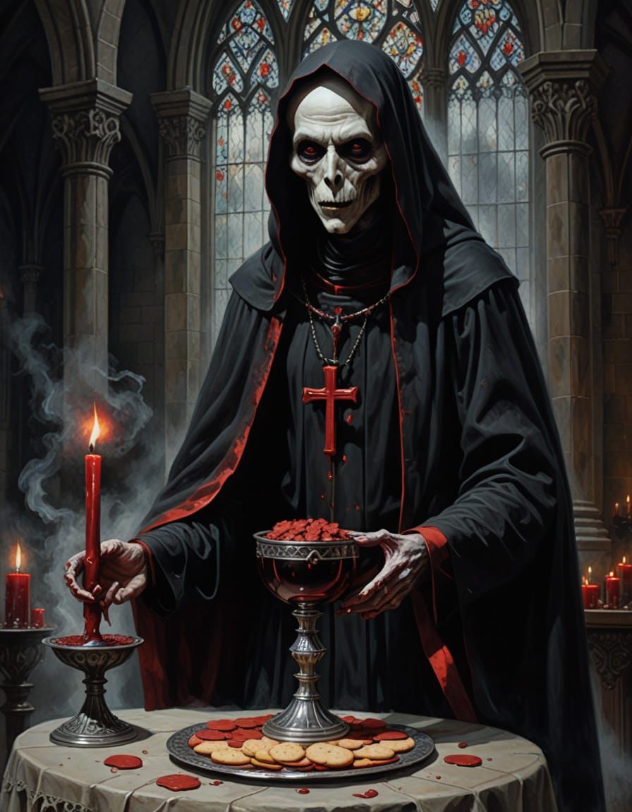 A sinister religious portrait of a veiled vampire at a church altar with communion wafer crackers and a silver goblet of blood-wine. The image has a dark gothic horror aesthetic.