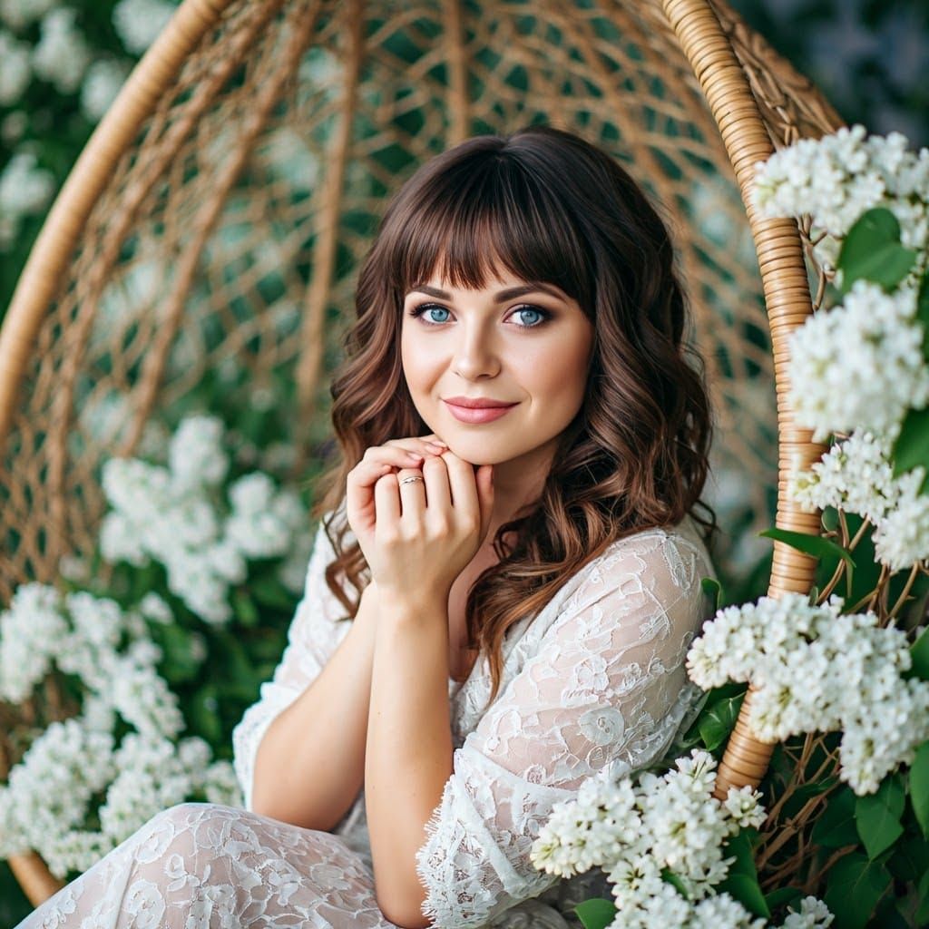 A digital painting of a brown-haired woman in a hanging chair amongst white lilacs. She wears a white lace dress and smiles gently, rendered with soft sfumato and fluid lines.
