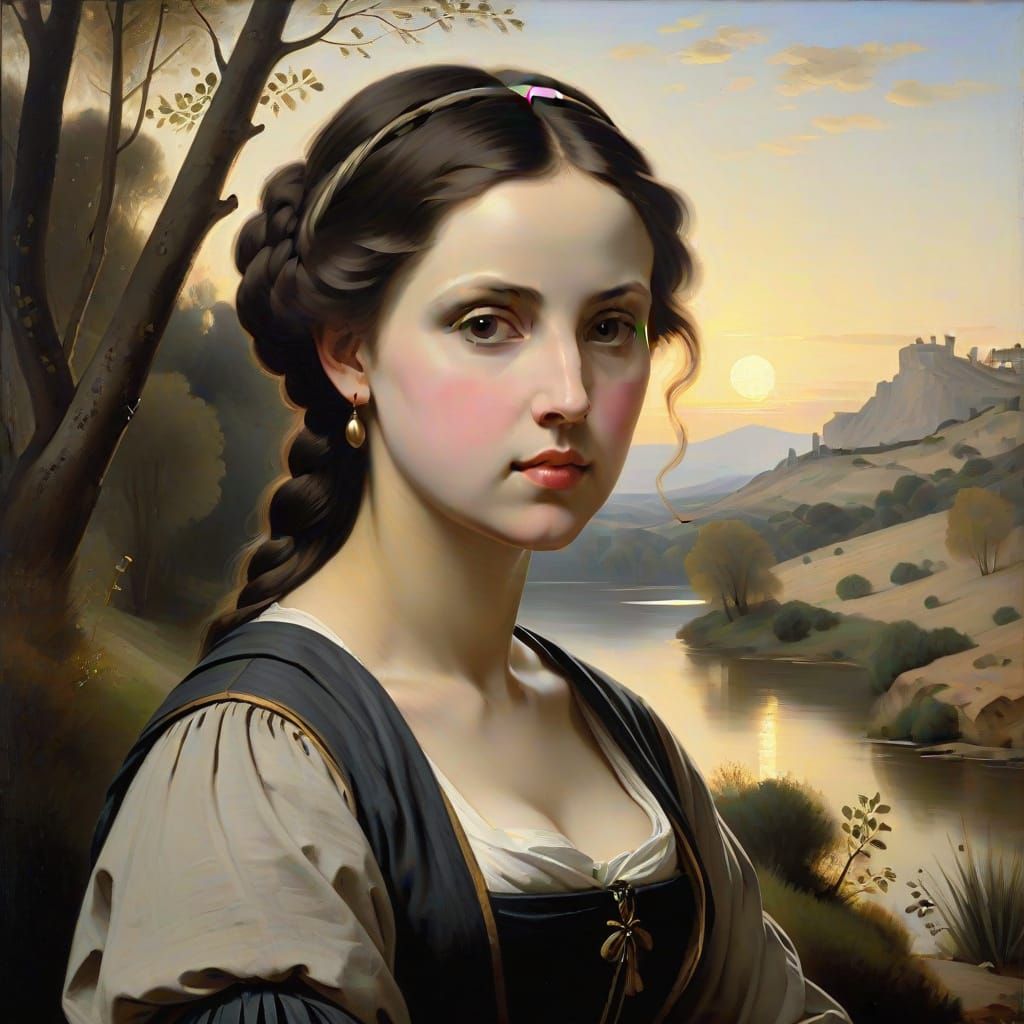 This image shows a serene portrait of a woman, reminiscent of 19th-century romanticism. The soft lighting and blurred background evoke a sense of tranquility, capturing the subject's contemplative mood with oil painting techniques.