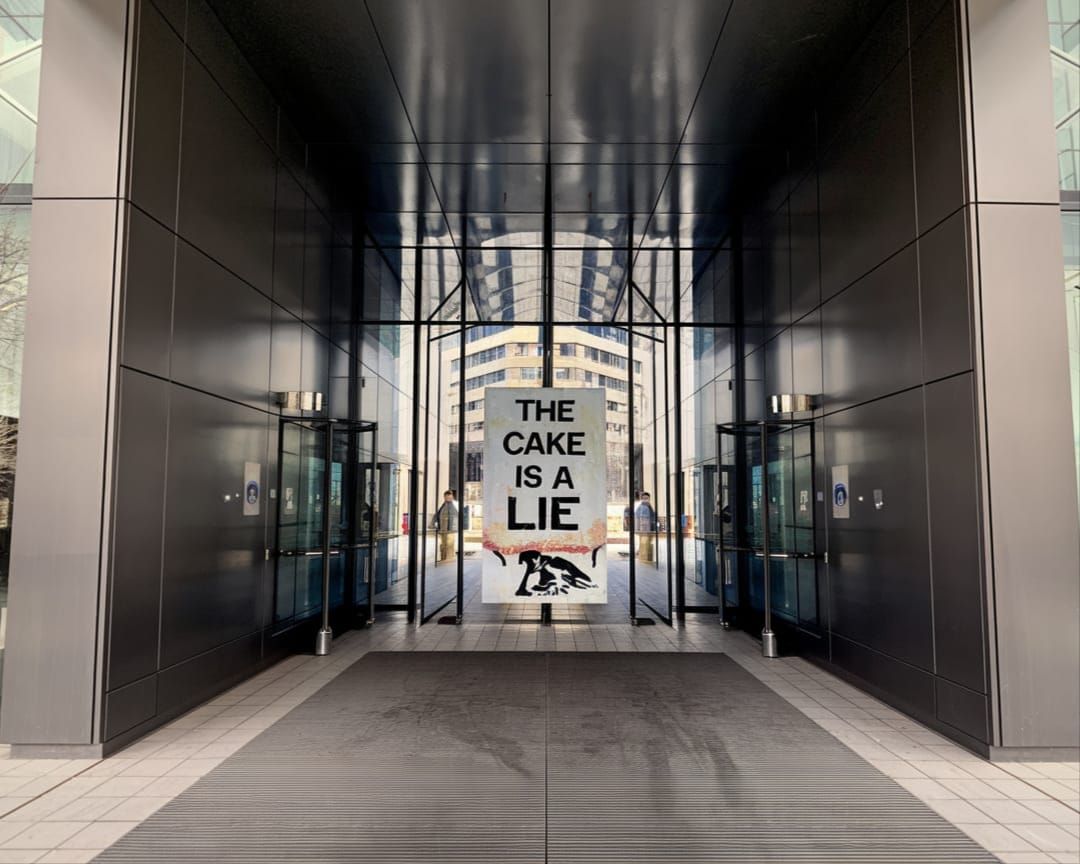 A Banksy-style graffiti piece reading "The Cake is a Lie" is displayed in the entrance of a modern building. The artwork is a stark contrast to the sleek architecture.