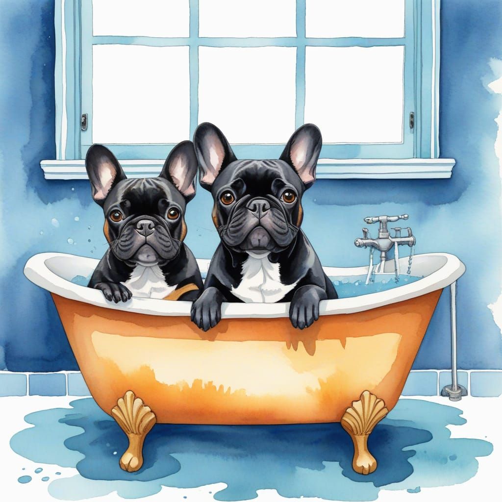 A joyful watercolor illustration of two happy French Bulldogs playing in a blue bathtub, reminiscent of a children's book. The artwork features a playful scene of these lovable dogs enjoying a fun bath time experience.