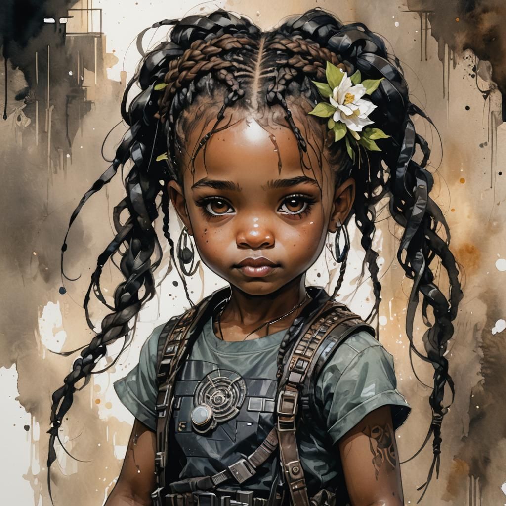 A delicate, watercolor-inspired portrait of an African American toddler girl with intricate braids and a small smile, surrounded by vibrant, complementary colors in a fantastical, dreamlike atmosphere.