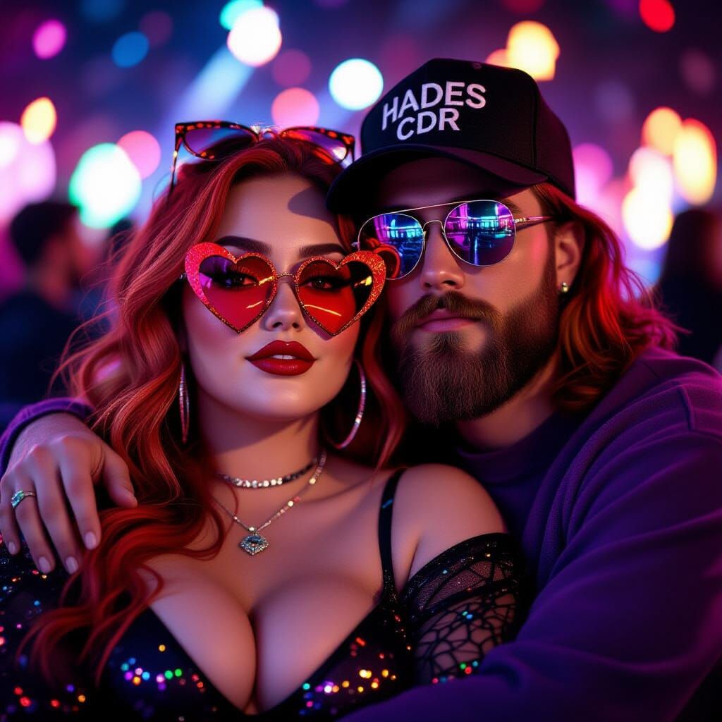 A romantic portrait of a chatty Canadian Gen-Z girl with a curvy figure and red heart-shaped sunglasses, wearing glittery black makeup and soft red lip stain, rests her head on the shoulder of a man with long red hair and a beard, donning spiral sunglasses and a royal purple sweater and black military ...