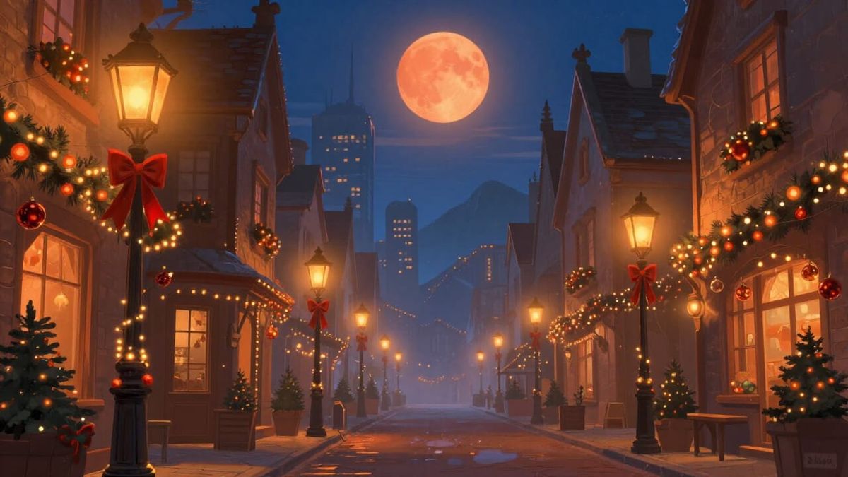 This image showcases a cozy city street at Christmas, bathed in warm, glowing lights and festive decorations. Fantasy concept art style with a painterly feel.
