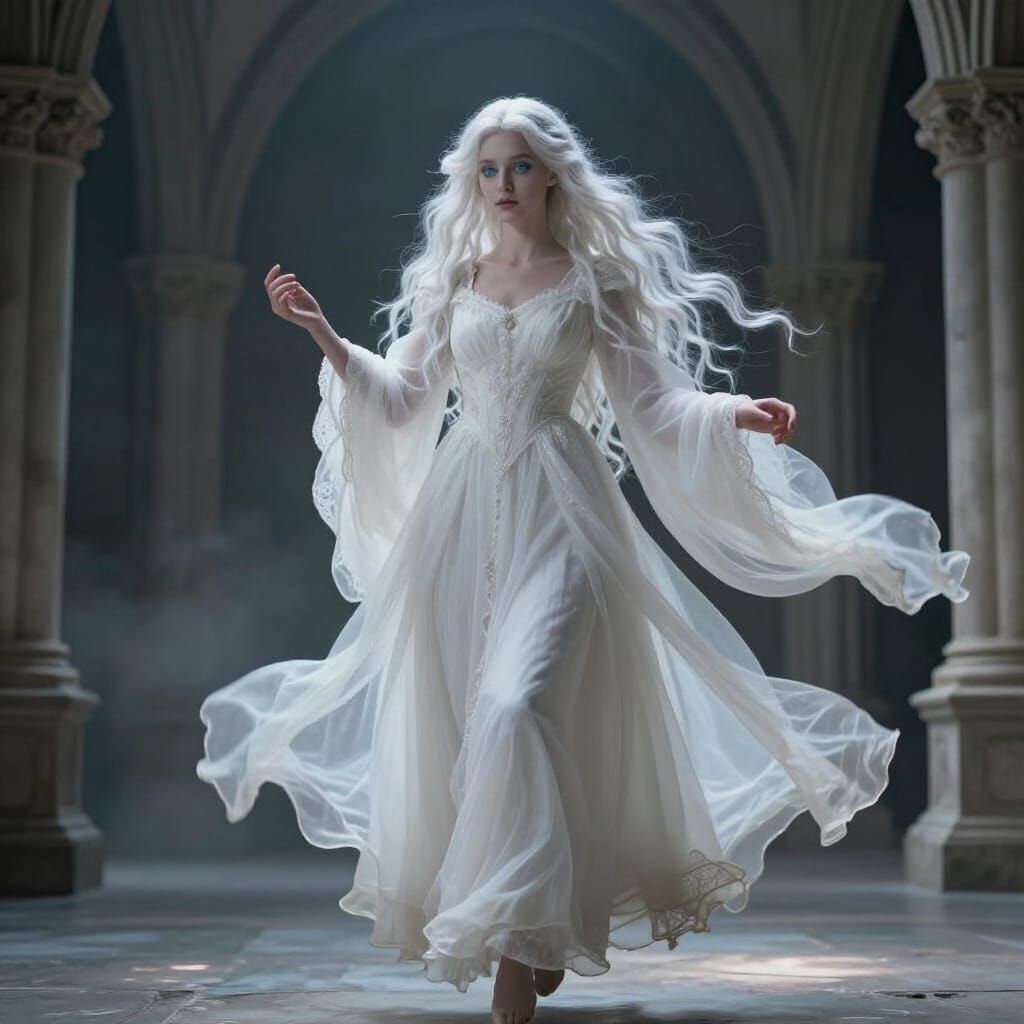 This image features a realistic cinematic portrayal of a young woman with pale skin and white hair, floating in a moonlit gothic courtyard. Her white gown flows as if in wind, conveying a sense of subtle melancholy and ethereal beauty.