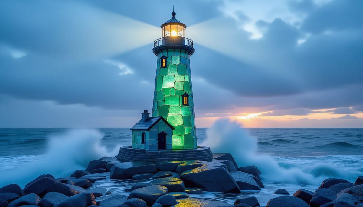 This photorealistic image features a lighthouse made of colorful sea glass, set against a stormy sea at dusk. Its beam pierces through the mist, highlighting the glass texture.