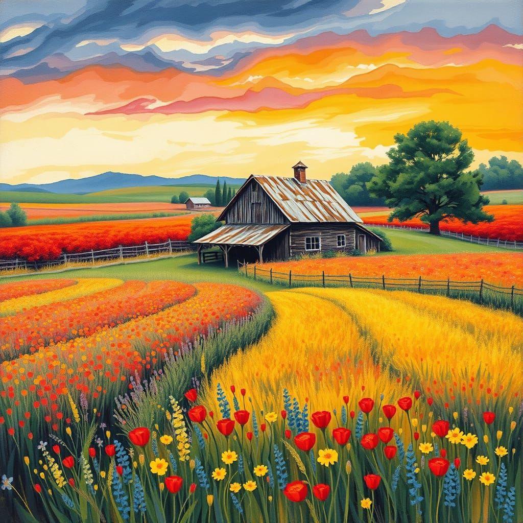 This vibrant painting depicts a rustic farm in a lush prairie, blending Gouache and Watercolor styles with thick brush strokes and textured colors, reminiscent of Impressionist masterpieces.