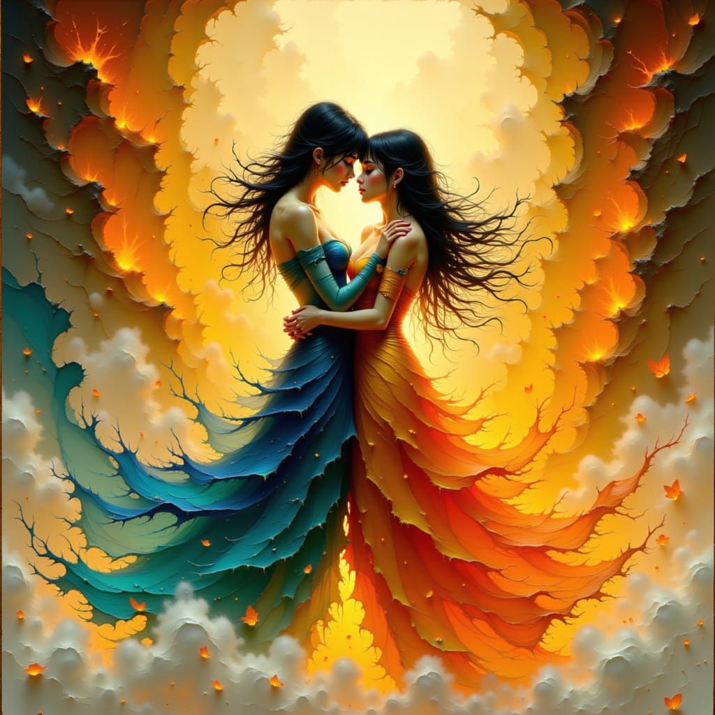 This image depicts a passionate embrace between elemental spirits of fire and water. They are surrounded by mist and bathed in warm, golden light, creating a dreamlike, romantic scene.