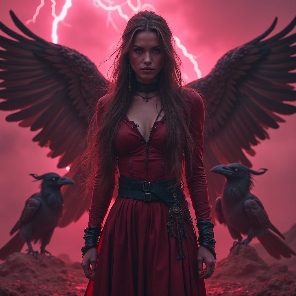 This image portrays a female Viking with long hair and purple eyes, dressed in cherry-colored attire amidst crows and fantasy elements. The scene features a bloody, apocalyptic backdrop with neon accents, rendered in a cyberpunk aesthetic.