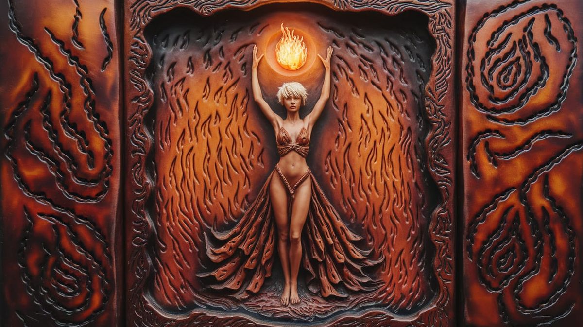 A striking picture of a leather relief sculpture depicting a woman holding a fiery orb. The artwork features flame patterns, fire sigils, and warm golden hues, creating a mystical scene.