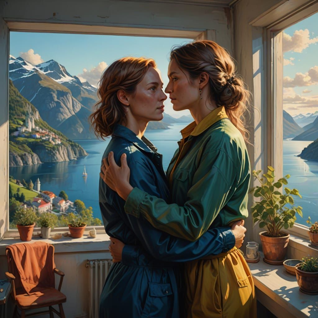 This intimate oil painting captures two women embracing in a modern apartment, bathed in warm golden light that highlights their skin tones and contrasts with the cool blues and greens of the fjord outside, creating a vivid and hyper-realistic scene.
