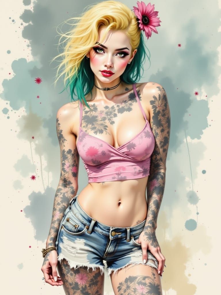 A full-body image of a pin-up woman with blond hair tipped in teal, making direct eye contact, rendered in a bold Japanese ink brush style.