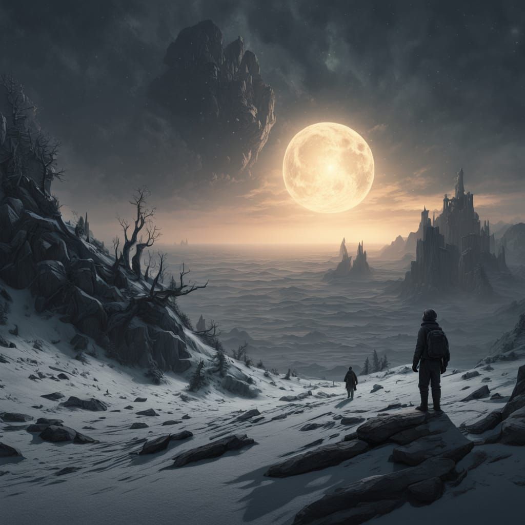 This image shows a solitary astronaut silhouetted against a massive black hole, surrounded by shattered celestial bodies. It evokes cosmic dread and solitude, rendered in a hyperrealistic, detailed matte painting style with dramatic lighting.