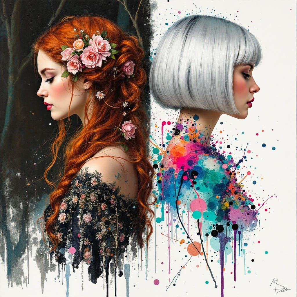 This image shows a diptych where a Pre-Raphaelite oil study meets a contemporary watercolor abstraction, blending traditional and modern techniques in a vibrant celebration of art and innovation