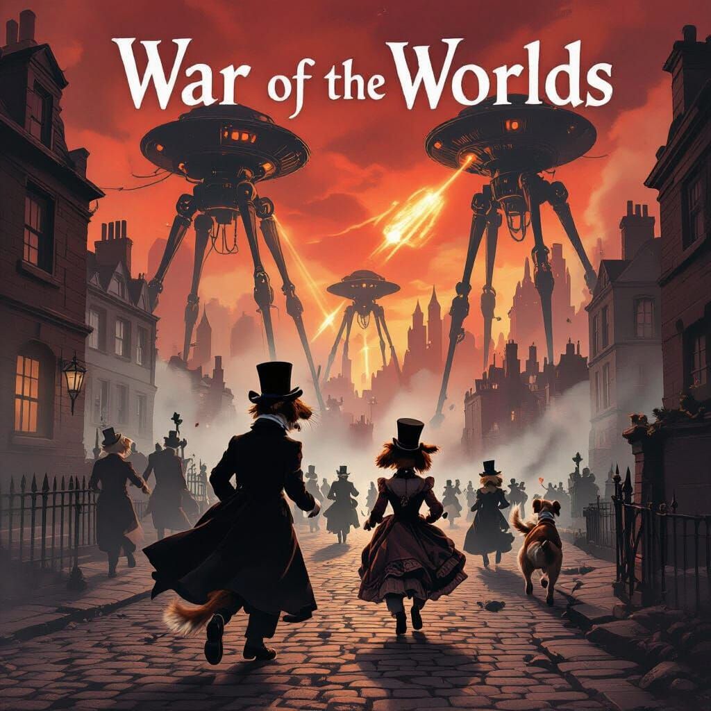This striking image depicts dogs in Victorian clothing escaping massive alien tripods in a chaotic, smoggy city. The artwork features dramatic lighting and a gothic illustration style, capturing a scene of urgent panic and destruction.