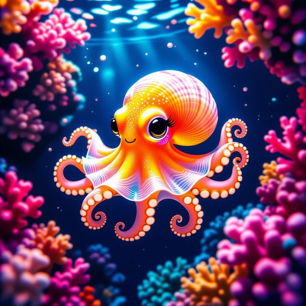 This image shows a glowing orange octopus swimming in deep blue water. The octopus wears a shimmering shell garment and is surrounded by vibrant corals in a photorealistic style.
