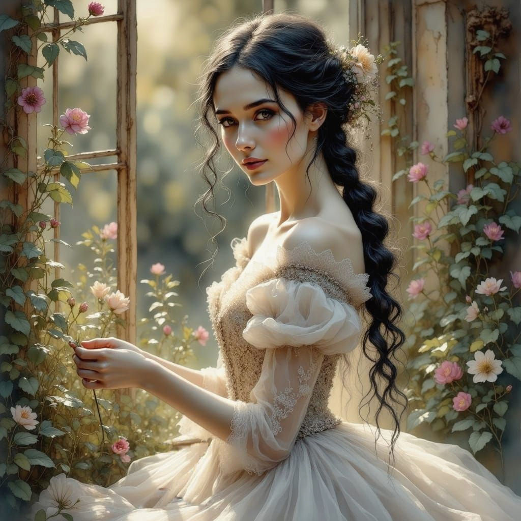A delicate gothic portrait of a young Russian noblewoman from the 1880s, dressed in white samite and adorned with black braids, rendered in a striking volumetric style with intricate details.