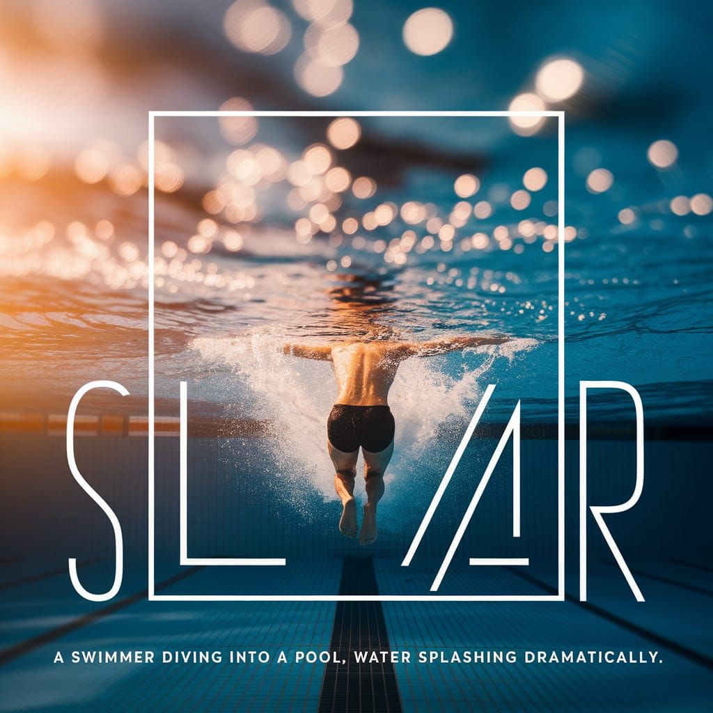 This image captures a swimmer diving into a pool with dramatic water splashes. Shot with a DSLR, it features a dynamic underwater perspective, sharp focus, and a cool blue palette with brilliant highlights.